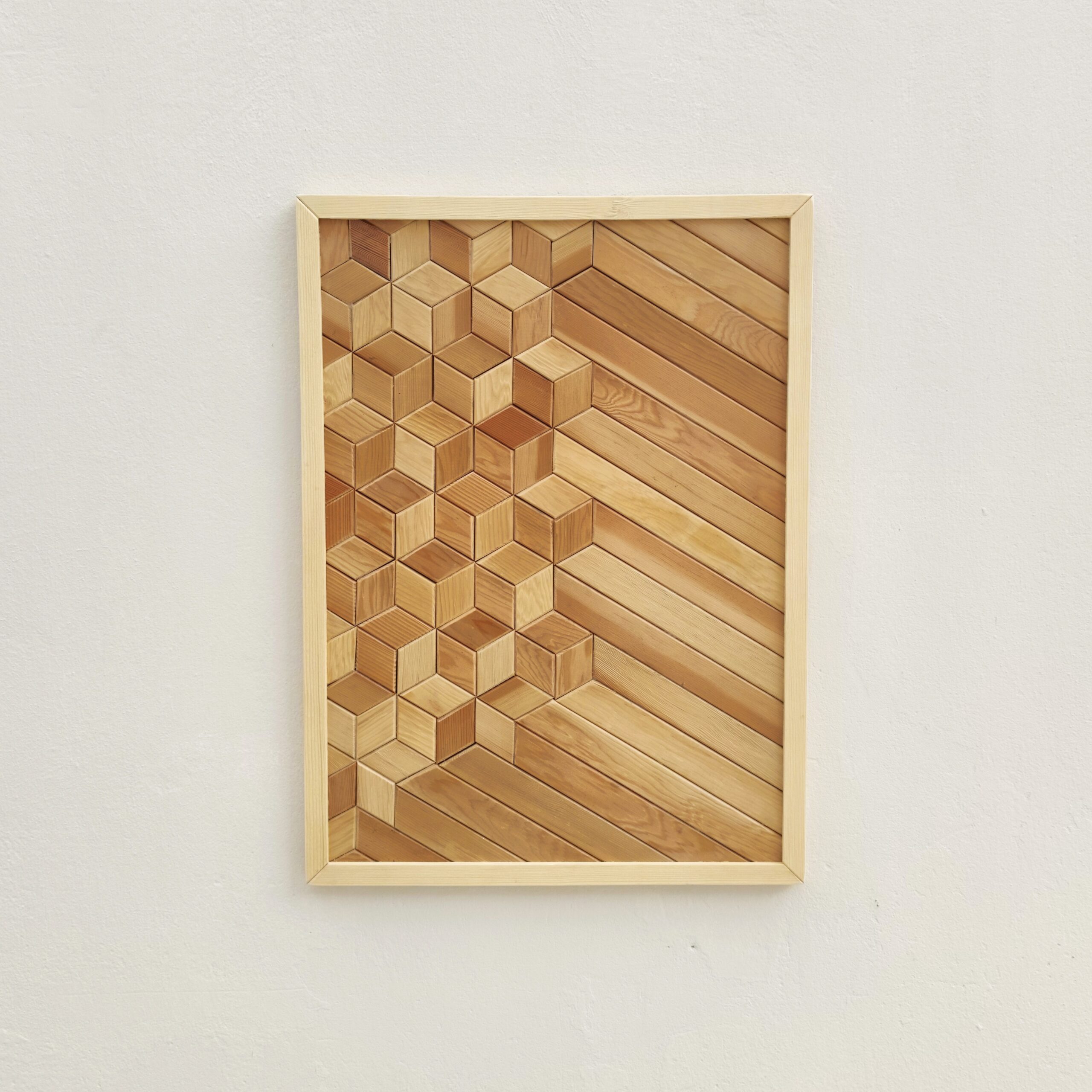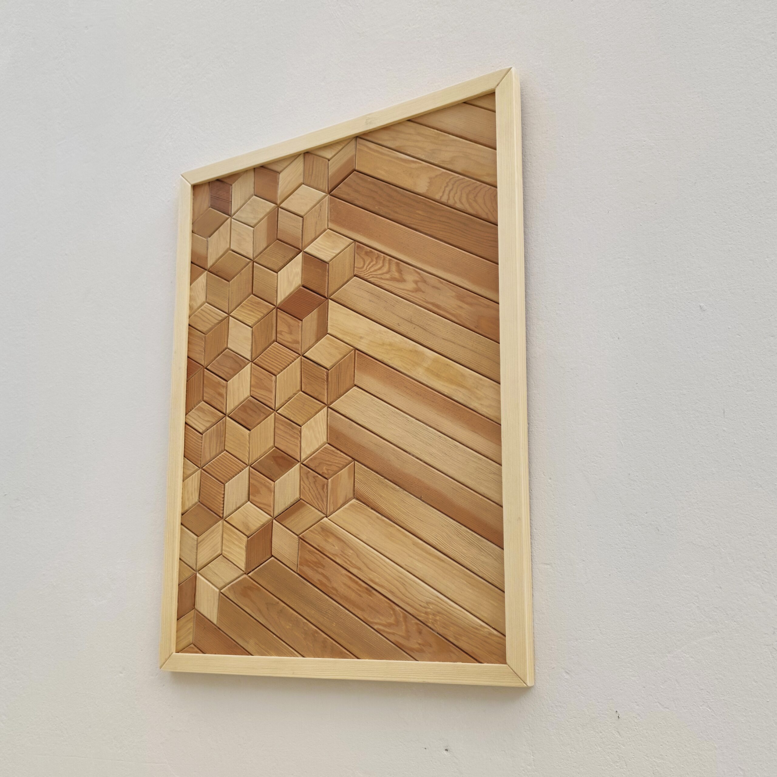 Εντυπωσιακό ξύλινο διακοσμητικό τοίχου σε κάδρο, κατασκευασμένο από φυσικό ξύλο Oregon Pine, που συνδυάζει γεωμετρία και τρισδιάστατη οπτική αισθητική. Το ιδιαίτερο μοτίβο με κυβιστικές φόρμες δημιουργεί ένα δυναμικό παιχνίδι βάθους και φωτός, προσφέροντας μια σύγχρονη και καλλιτεχνική πινελιά στον χώρο.